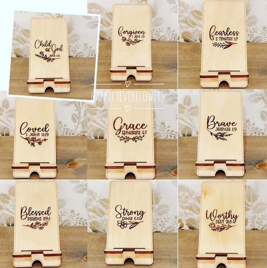 Wooden phonestand, Child of God, Forgiven, Fearless, Loved, Grace, Brave, Blessed, Strong, Worthy phonestand, personalized phone stand